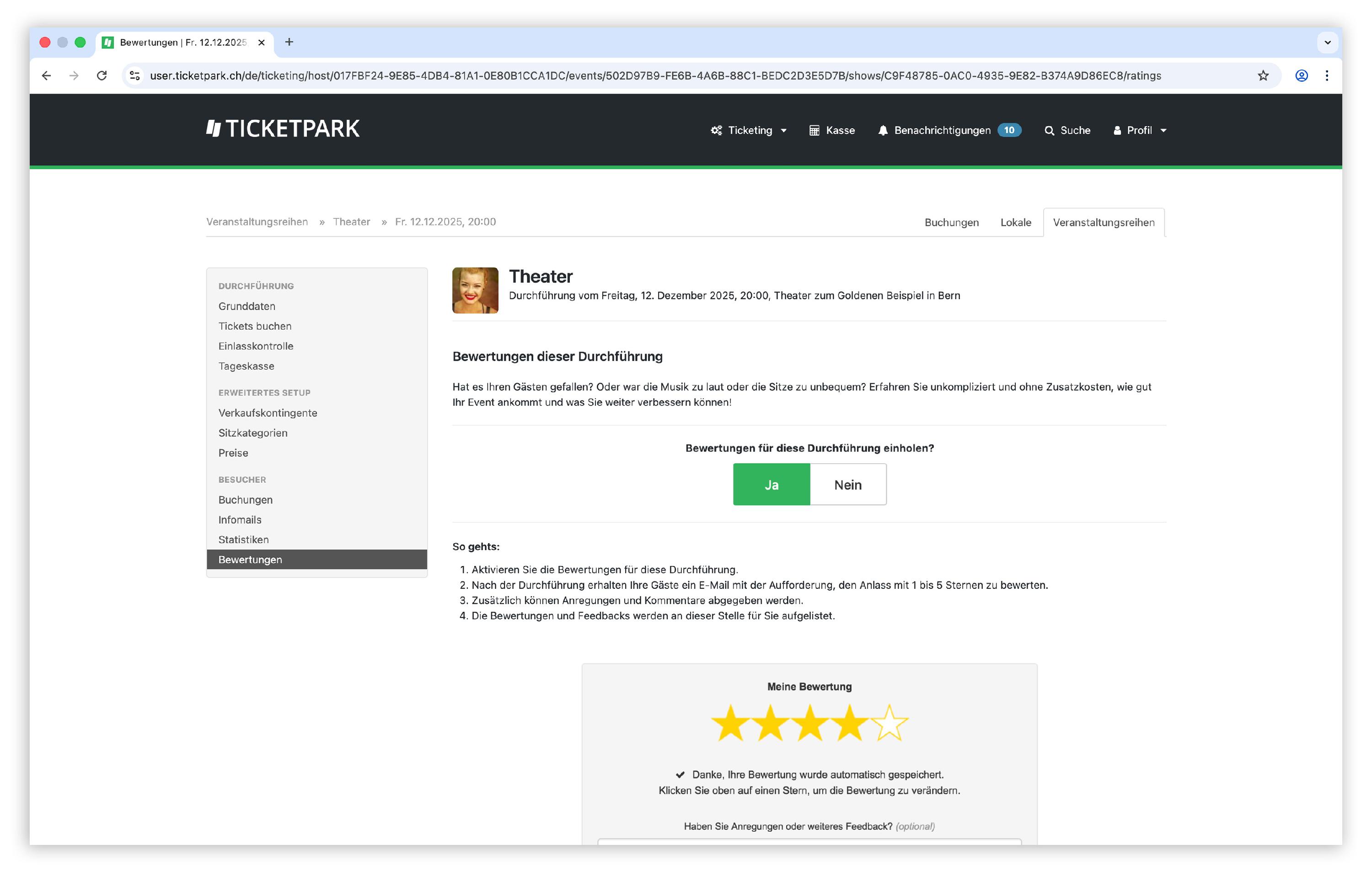 Damit Ihre Gäste nach dem Anlass eine E-Mail mit einer Bewertungsmöglichkeit erhalten, können Sie für einzelne oder alle Durchführungen die Bewertungen einschalten.