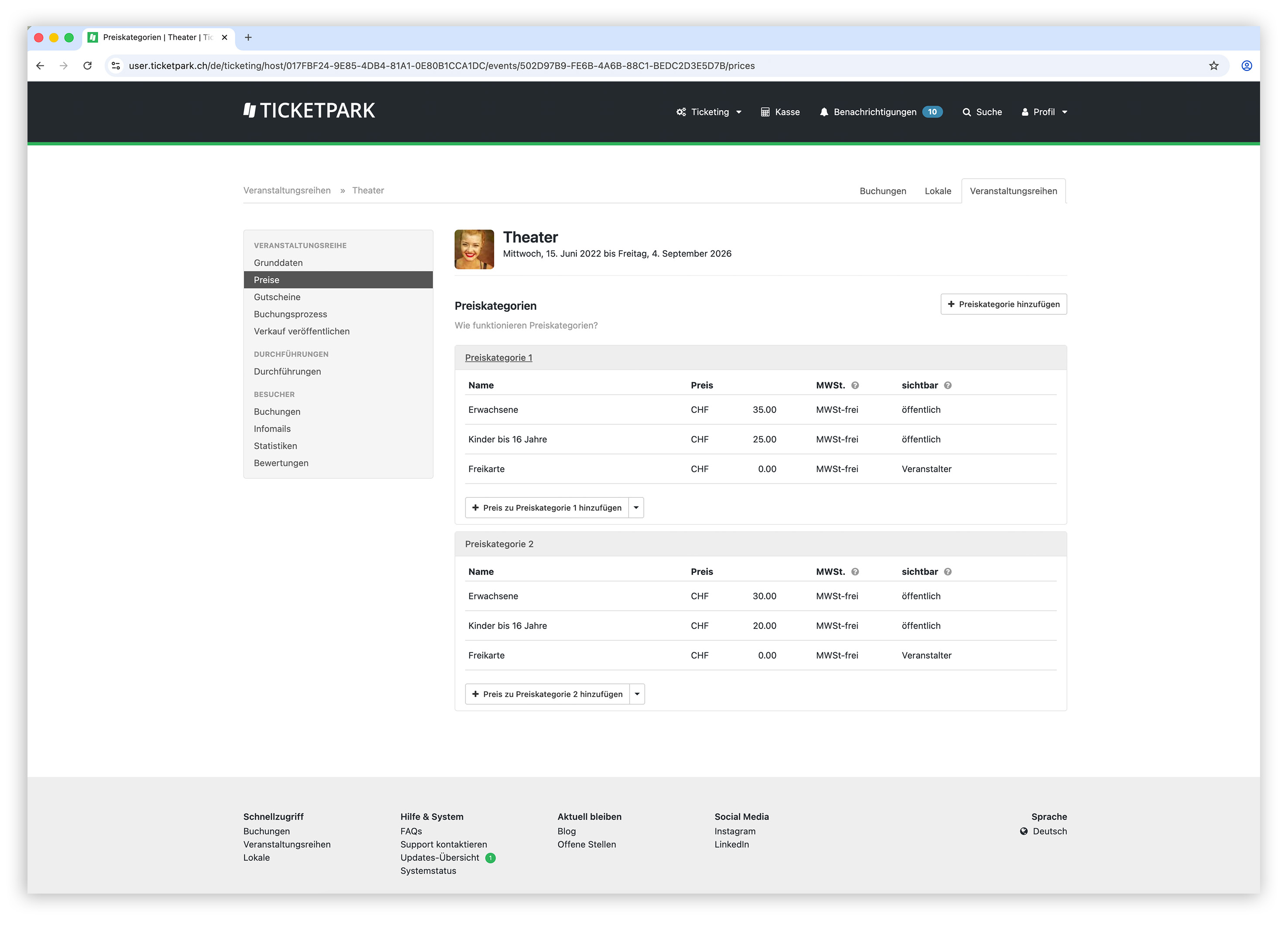 Um als Veranstalter Freikarten zu buchen, erstellen Sie einen entsprechenden Preis: